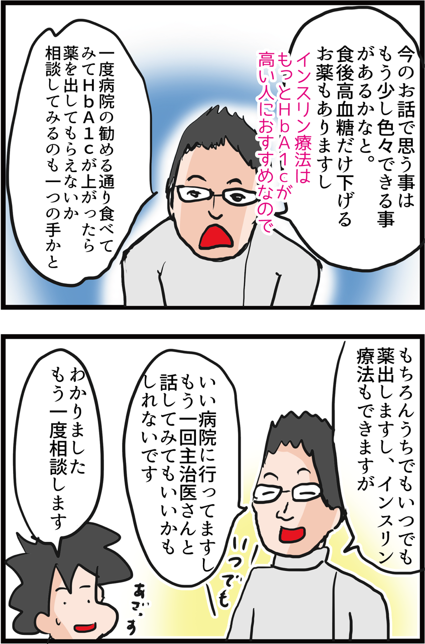 結局、今の夫のヘモグロビンA1cの数値でやらないという事になったのですが、考えていただいたお気持ち、うれしいです。